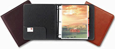 Product Description : This executive-style three ring binder is perfect for that great first impression. Durable three-ring system with horizontal pocket inside front cover. Pocket has slot for business card storage. European soft cowhide. 1 1/4" rings.